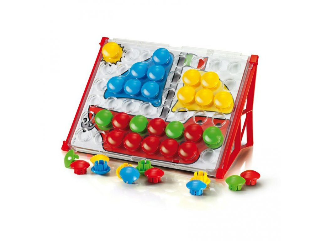Mozaiky určené dětem již od 2 let rozvíjejí vizuomotorickou koordinaci, jemnou motoriku a tvořivé myšlení. Balení obsahuje 48 velkých nerozbitných knoflíků o průměru 32 mm, průhlednou desku s otvory, pod kterou lze snadno vložit jednu z 8 oboustranných karet s 16 předlohami (barevné nebo černobílé obrázky), a stojánek, který umožňuje usazení desky v nakloněné poloze.
