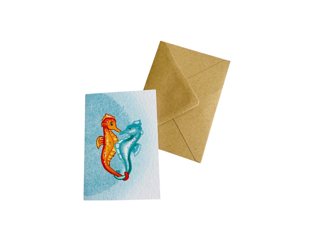 Blahopřání „Mořská láska“ je něžným symbolem partnerství, věrnosti a hravé radosti. Na přední straně se vyjímá originální autorská ilustrace dvou mořských koníků, kteří se dotýkají čumáčky a mají propletené ocásky. Tento motiv vyjadřuje blízkost a pevné pouto, které spojuje dva, co patří k sobě.