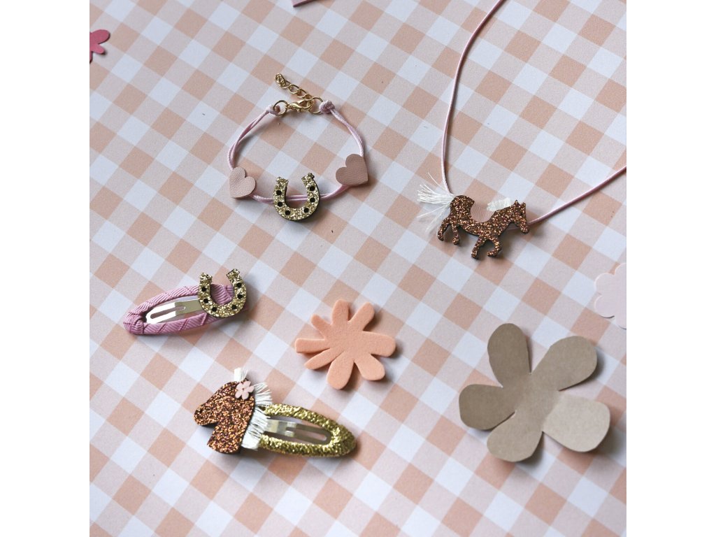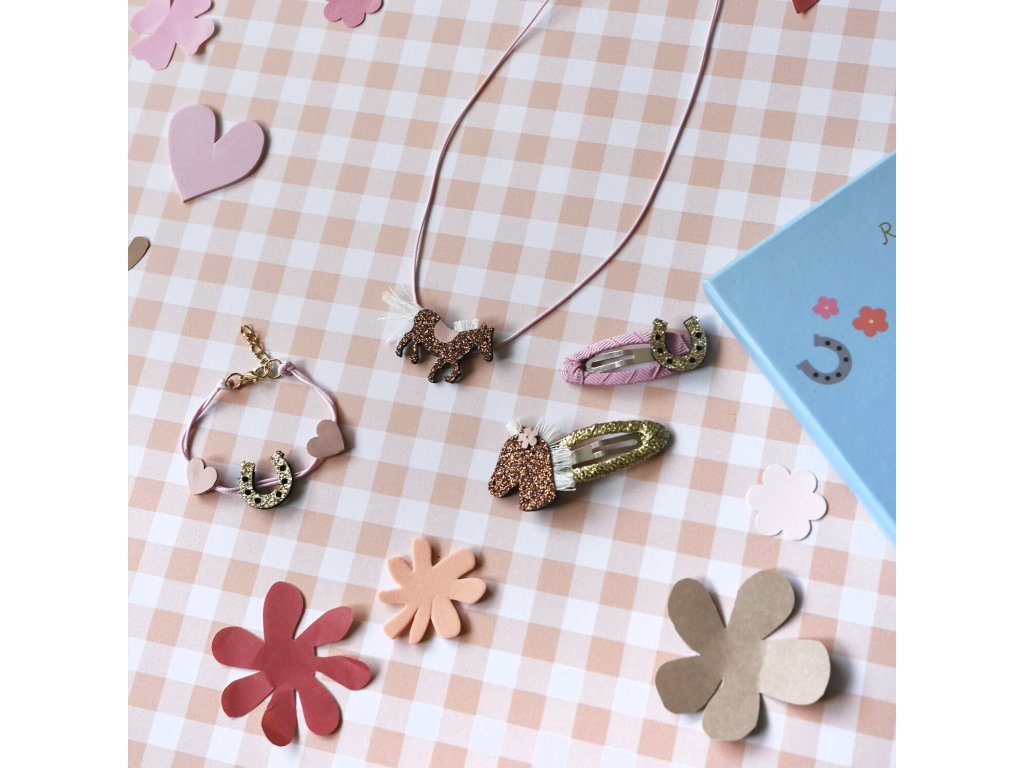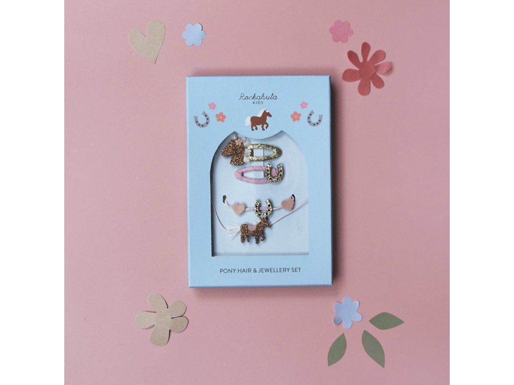 Dárková sada s doplňky s motivem poníka Peggy je perfektním dárkem pro malé milovníky jezdectví! Obsahuje dvě třpytivé sponky do vlasů – jednu s poníkem a druhou s podkovou pro štěstí – a navíc třpytivý náhrdelník s poníkem a ladící náramek s podkovou. Vhodné od 3 let.