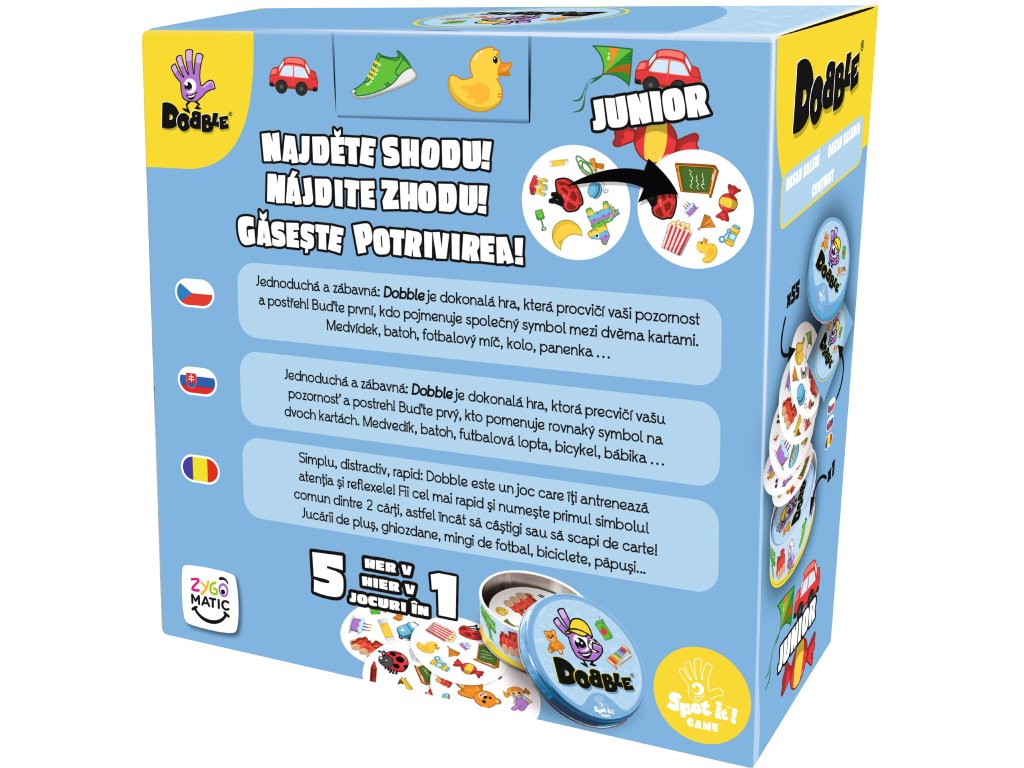 Hra nabízí zcela unikátní zábavu. Hráči zde hledají dva stejné symboly na kartách při různých verzích hry (v pravidlech je popsáno celkem 5 her). Super jsou kulaté karty i jednoduchá pravidla vysvětlená doslova za pár sekund. Cílová skupina jsou děti i rodiče - všichni, kdo se chtějí pořádně bavit a nemají čas pročítat dlouhá pravidla. Plechová krabička zaručuje bezpečí karet a jednoduše umožňuje mít hru vždy u sebe. Vyzkoušejte i vy postřehový fenomén Dobble a jistě budete překvapeni, jak i tak jednoduchá hra může být zábavná!