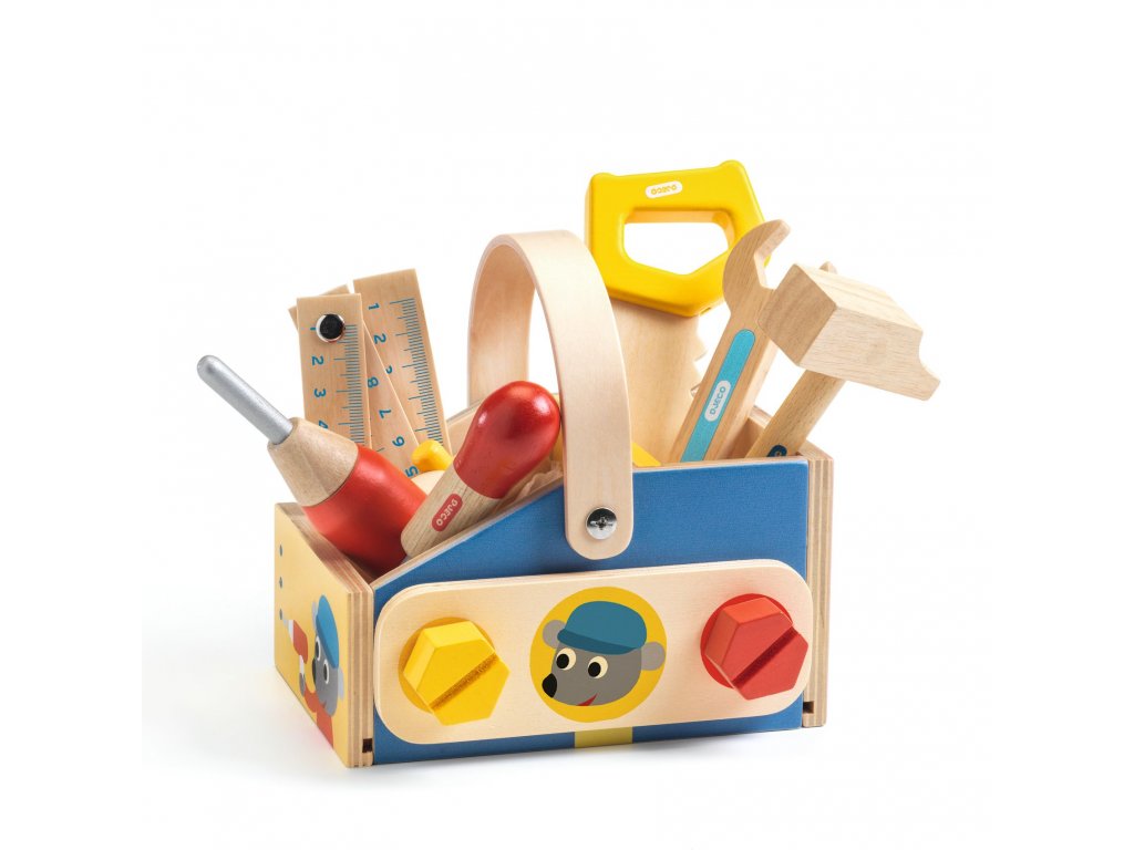 Kompletní sada pro kutily obsahuje 6 nástrojů a 1 úložný box se 2 přihrádkami, na kterém jsou umístěny šroubky, které je možno šroubovat. Rozvíjí motoriku a představivost. Dřevo s certifikací FSC.
