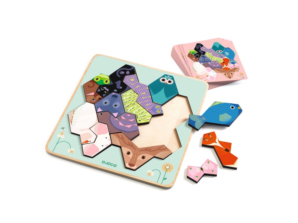 S touto originální vzdělávací hrou se děti seznámí se základy geometrie a prostorového vnímání prostřednictvím oblíbeného tématu – zvířátek. Úkolem je dřevěné dílky doplnit do základu podle předlohy. Děti se tak učí vizualizovat tvary v prostoru, rozvíjejí logické myšlení a procvičují jemnou motoriku.