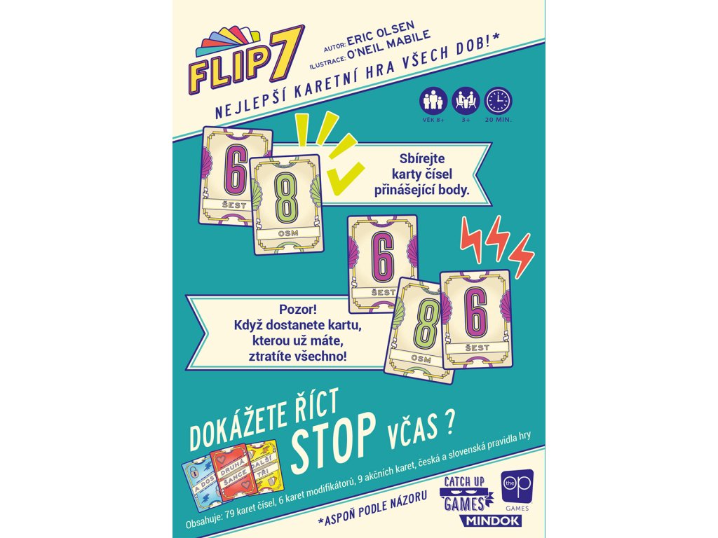 Vyzvěte štěstí ve hře Flip 7, kde sbíráte karty, sčítáte body, ale musíte vědět, kdy zvolat STOP, abyste nepřišli zkrátka! Získejte Šťastnou sedmu nebo využijte akční karty k dosažení vítězství. Ideální pro 3 a více hráčů od 8 let a oceněna jako nejlepší party hra roku 2024 podle BoardGameGeek.com! Vhodné od 8 let.