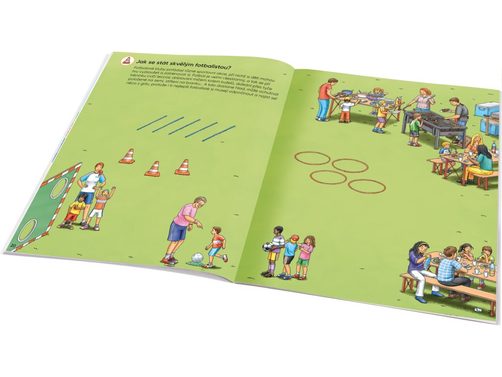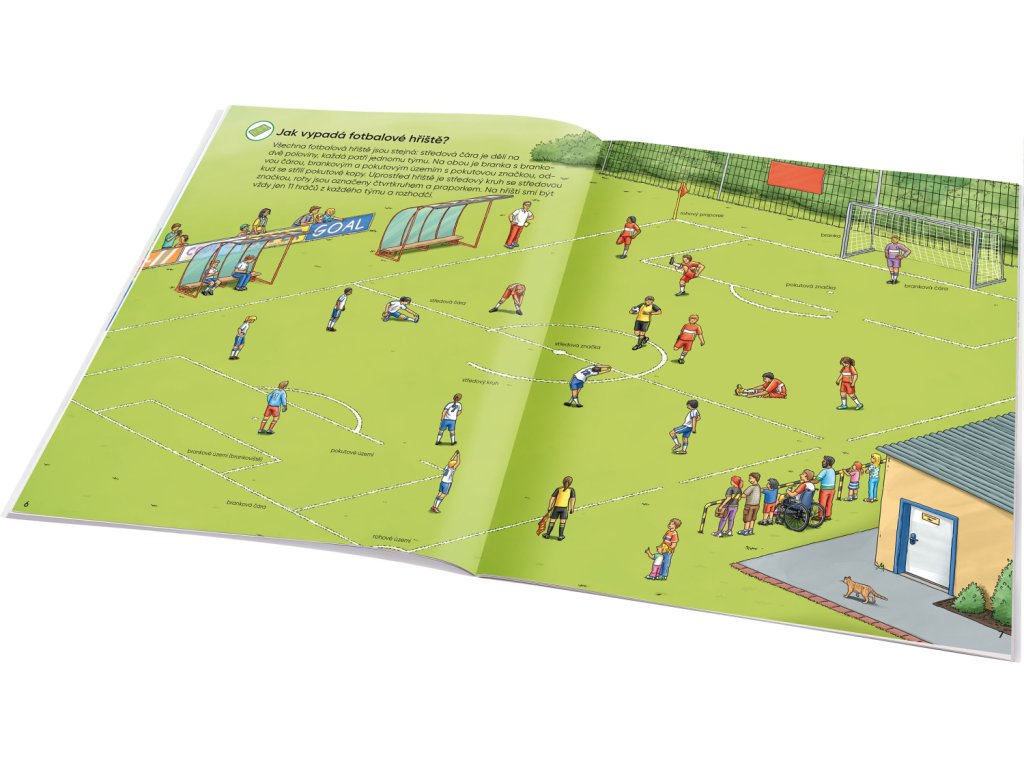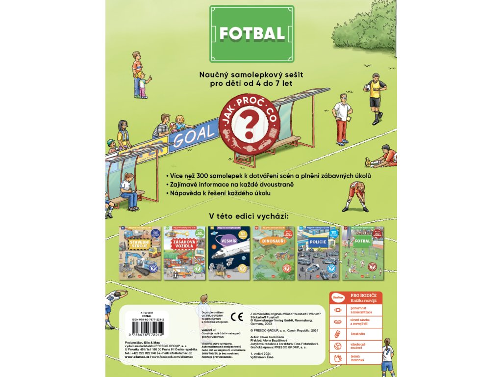 Jak? Proč? Co? V tomhle naučném samolepkovém sešitě pro děti od 4 do 7 let najdete odpovědi snad na všechny zvídavé otázky týkající se populární kolektivní hry – fotbalu. Na každé dvoustraně se dočtete spoustu zajímavostí, a navíc máte k dispozici přes 300 samolepek k dotváření scén a plnění zábavných úkolů! Ty zapeklitější vám dají možná trošku zabrat, ale žádný strach – na konci knížky nechybí malá nápověda…