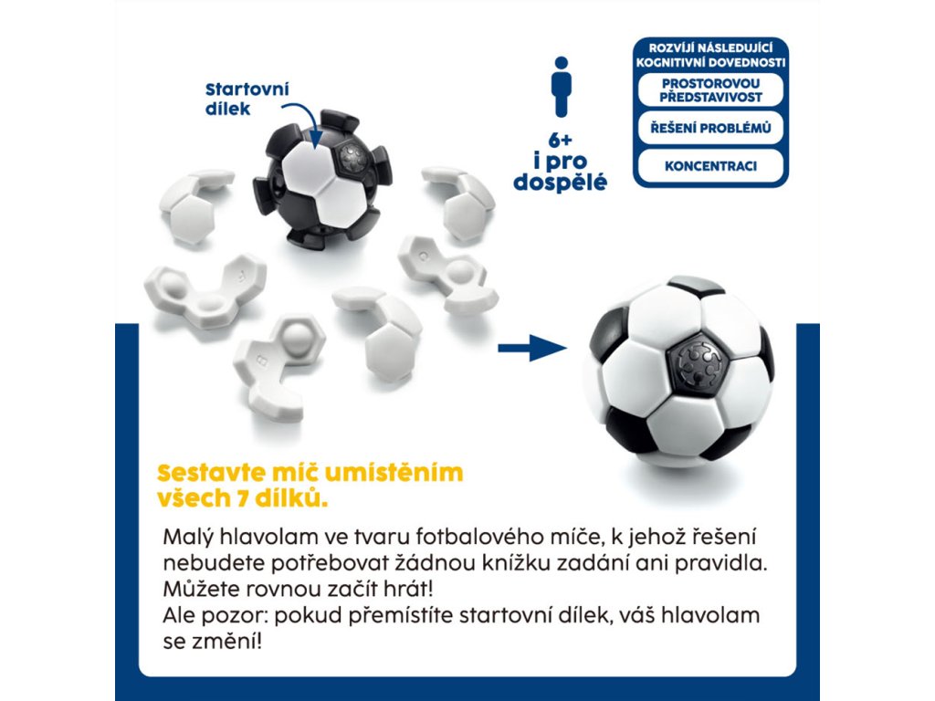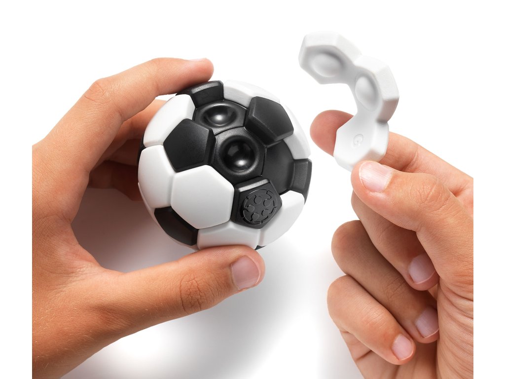 Fotbalový míč je chytlavý 3D hlavolam pro jednoho hráče, ve kterém se snažíte sestavit celý míč z 7 bílých dílků na černém jádře. Sami volíte startovní pozici pro dvoupolní dílek z 24 možností a musíte dodržet pravidlo střídání prohlubní. Nacvakněte zbylých 6 dílků a najděte jedno z mnoha možných řešení, jak míč kompletovat! Vhodné od 6 let.