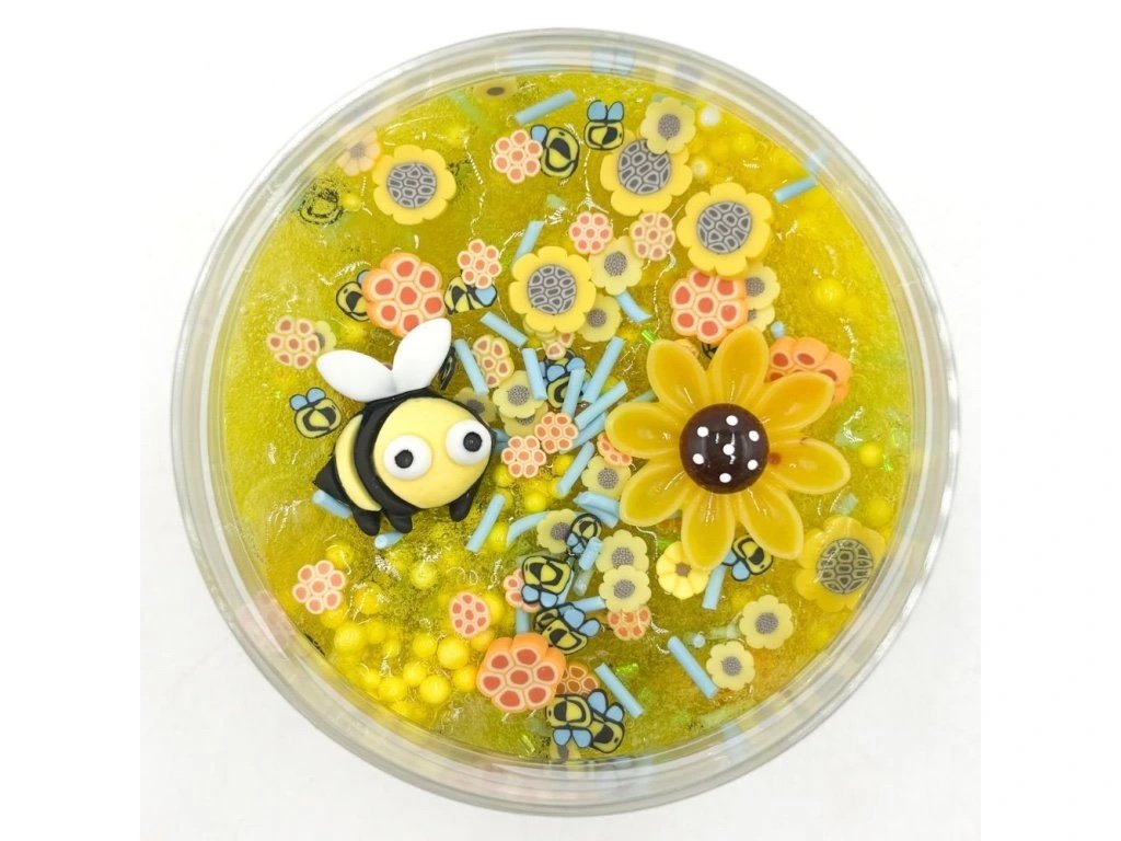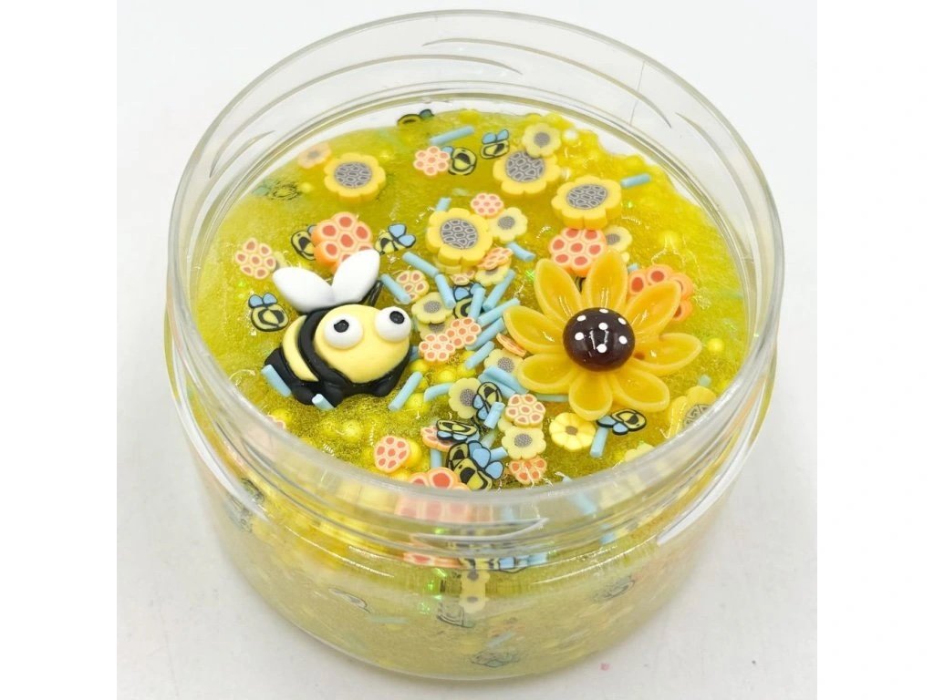 Obsah: 150 g gumového slizu, konfety, třpytky, pěnové kuličky, včela, slunečnice