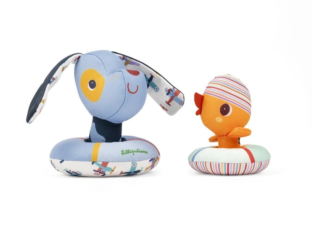 Pejsek Jules a káčátko Gaspard si vesele plavou! Tyto dvě hračky do vany jsou ideální pro miminka od 6 měsíců a zpříjemňují jim koupání.