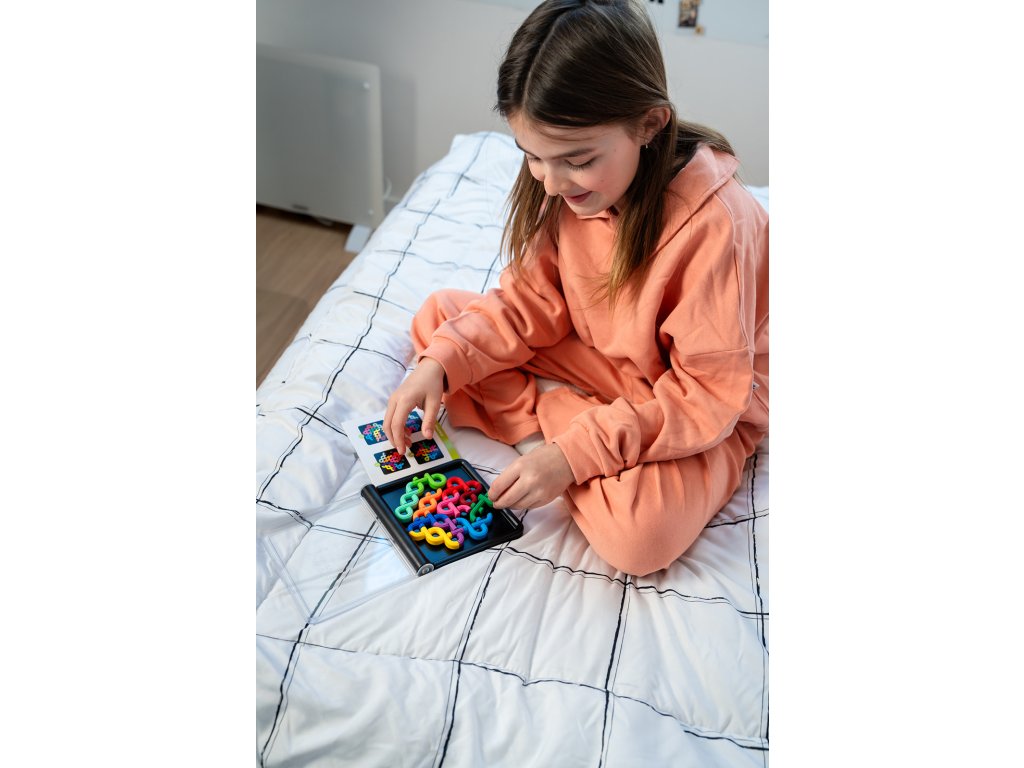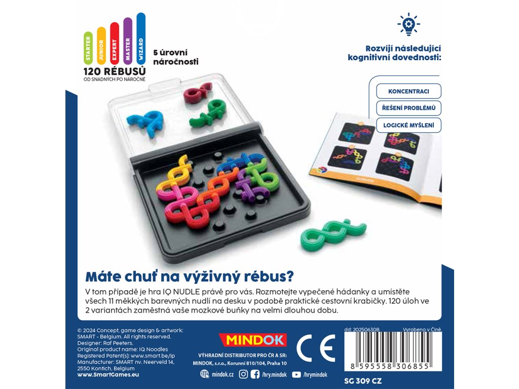 IQ Nudle je kompaktní hlavolam pro jednoho hráče, ve kterém musíte umístit všechny dílky na desku tak, aby jejich volné konce na sebe navazovaly a vytvořily uzavřené smyčky. Vyzvěte svou logiku v úlohách od těch se startovní pozicí až po úroveň MASTER, kde máte k dispozici jen obrys řešení. Každá úloha má pouze jedno správné řešení! Vhodné od 7 let.