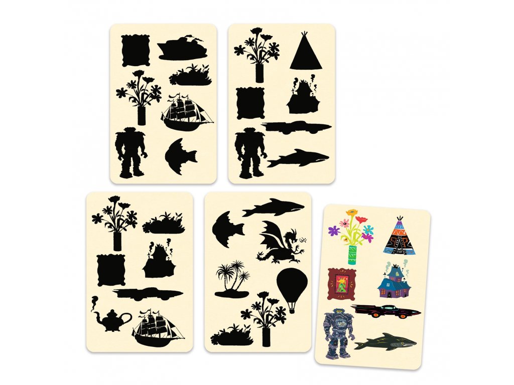 Zajímavá postřehová hra od Djeco. Ve hře jsou dva balíčky karet, jeden se siluetami objektů, který se rozloží po celém stole, a druhý s barevnými obrázky, z něhož se karty ukazují postupně. Otočí se karta s obrázky a vaším úkolem je co nejrychleji najít mezi kartami černobílých siluet takovou, která obsahuje stejné objekty. Nejrychlejší vyhrává kolo. Vhodné pro děti od 4 do 12 let, pro 2-5 hráčů.