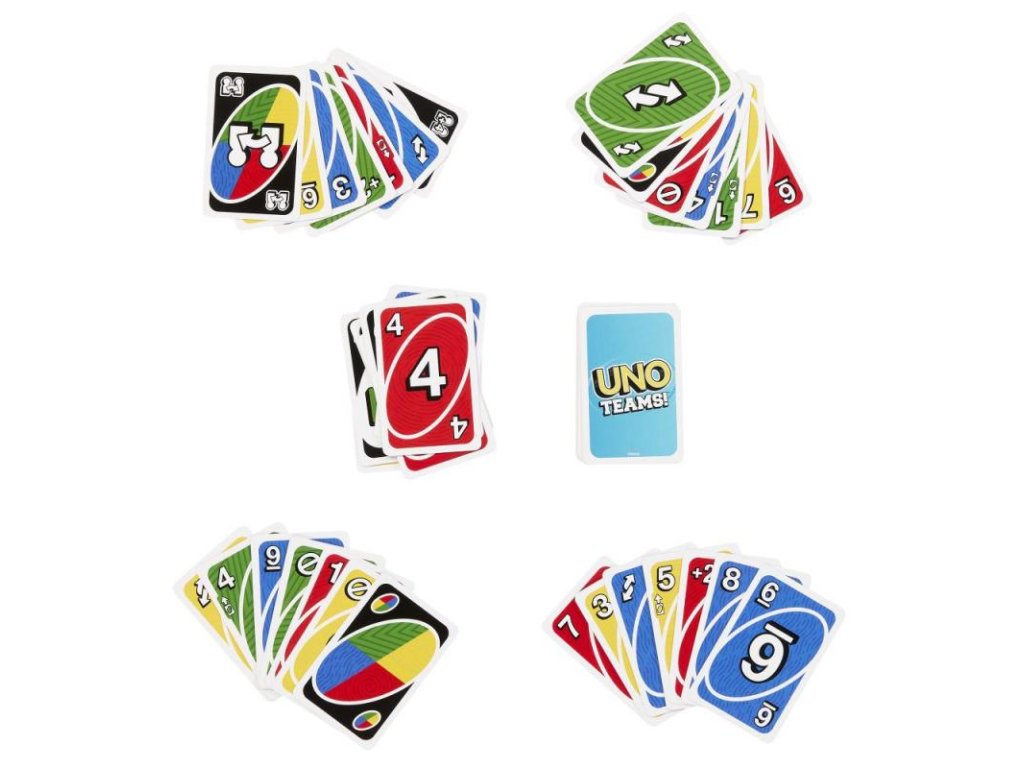 UNO Teams je nový způsob hraní této klasické hry! Hráči stále porovnávají barvy, čísla a symboly, ale místo toho, aby každý hrál sám za sebe, spojí se do dvojic a hrají společně o vítězství. Speciální karty a pravidla pomáhají spoluhráčům spolupracovat, ale oba hráči se musí zbavit všech karet ve svých rukou, aby vyhráli. Vhodné od 7 let.