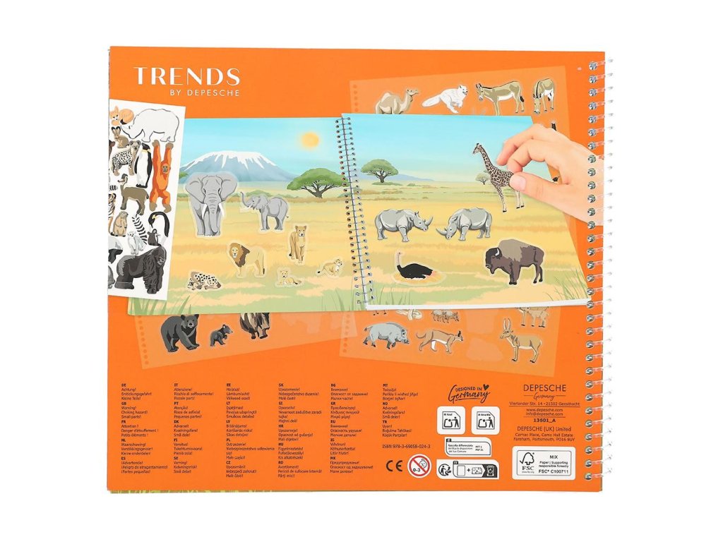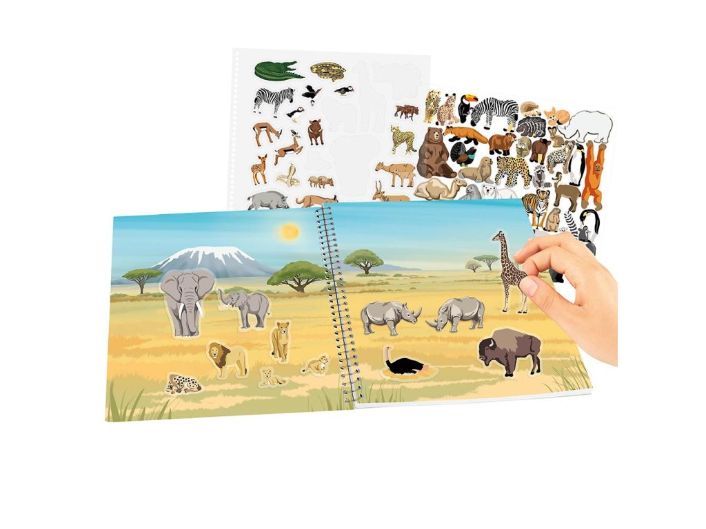 Na 16 krásně ilustrovaných stránkách mohou děti vytvářet vlastní scény ze savany, džungle nebo pouště pomocí více než 200 samolepek s motivy slonů, žiraf, lvů, zeber a mnoha dalších zvířat.