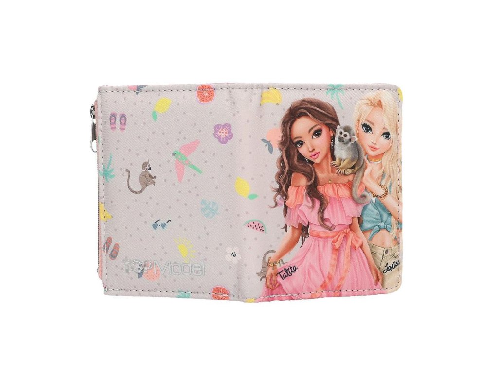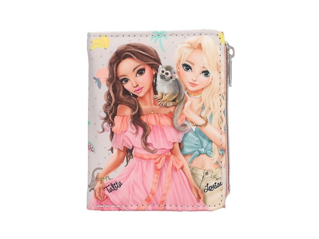 Látková peněženka od Top Model z kolekce Juicy je praktický doplněk pro děti, které mají rádi originální a hravý design. Peněženka zaujme motivem opičky a modelek Talita a Louise a veselými exotickými prvky.