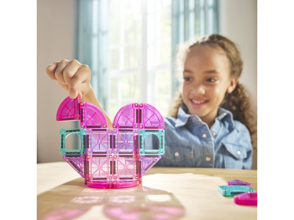 Stavějte od srdce – kdekoli na cestách! Cestovní magnetická stavebnice přináší lásku, kreativitu a zábavu v kompaktním balení. Třpytivé růžové a tyrkysové dílky spolu s dekorativními oblouky a čtvrtkruhovými tvary inspirují děti k tvorbě srdíčkových staveb, pohádkových věží či originálních uměleckých výtvorů. Díky malému formátu je tato sada ideální pro cestování – kreativita může děti doprovázet kamkoli.