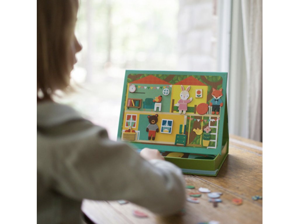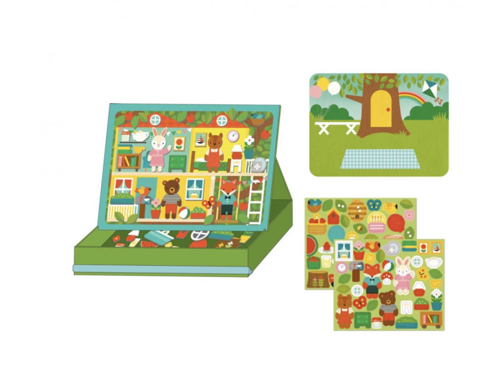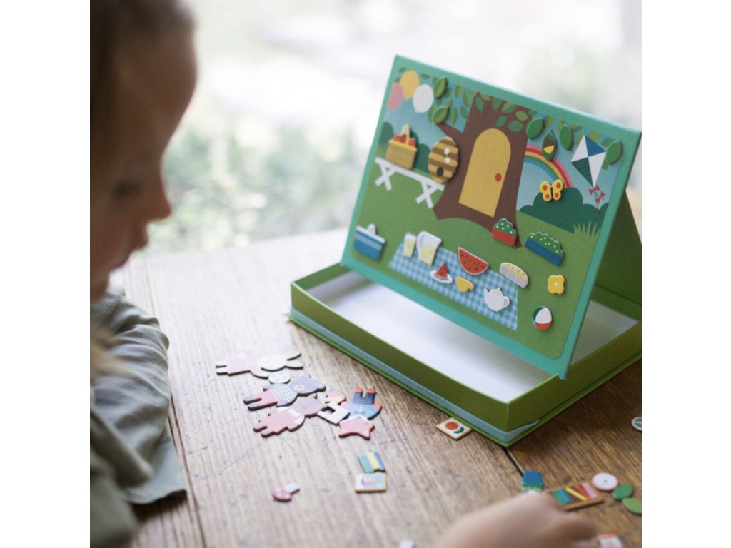Dekorujte svůj zvířecí domeček nebo vytvořte roztomilý piknik pro zvířata v parku. Tento přenosný hrací set lze použít jako divadélko. Má dvě pozadí, z kterých si můžete vybrat, a také přes 72 magnetických dílků. Magnetickou scénku lze postavit díky zarážkám v krabici. Krabice ve stylu stojanu obsahuje elastickou gumičku, kterou můžete použít pro rychlý úklid. Kreativní hračka s nekonečnými možnostmi kombinací a scén. Pro děti od 3 let věku.