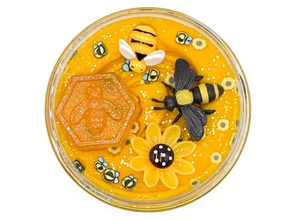 Obsah: 250 g voňavé a měkké domácí modelíny, žlutá s vůní medu, třpytky, konfety, figurka včely, malá včelka, pryskyřicová plástev, květina