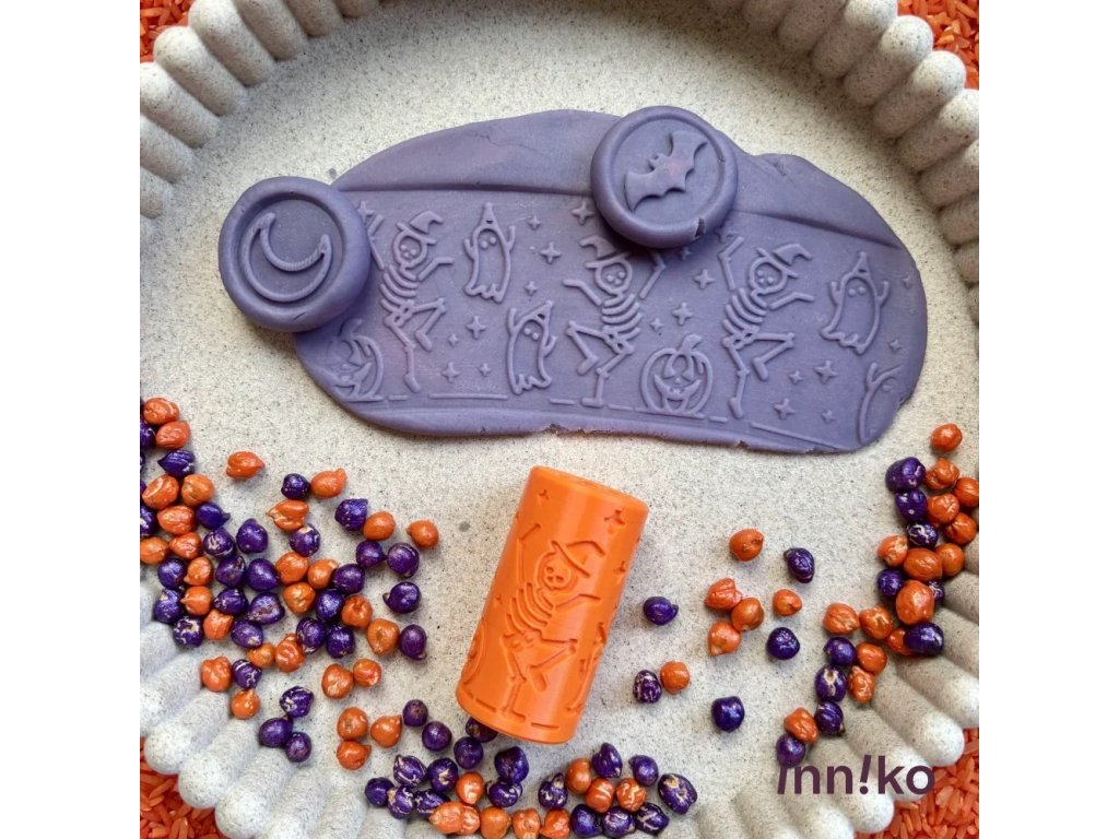 S válečkem s motivem tančících kostlivců, duchů a dýní, spolu s tiskátky netopýra a měsíce, vykouzlíte strašidelnou halloweenskou scenérii i doma. Hra s obtiskovacím válečkem rozvíjí dětskou kreativitu a jemnou motoriku, a zároveň přináší chvíle radosti nejen pro děti, ale i pro jejich rodiče.