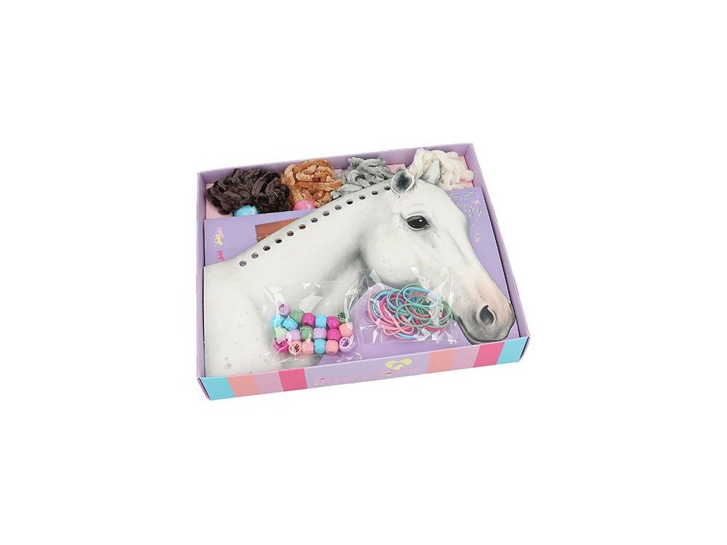 Užijte si plno zábavy s touto kreativní sadou oblíbené značky Miss Melody. Sada obsahuje 8 šablon koňské hlavy s dírkami, 4 chlupaté bavlnky, korálky a gumičky. Vytvořte si svou hřívu, stačí provléknout bavlnku dírkami a pak už je jen zaplést do nejrůznějších copánků a dozdobit podle vaší fantazie.