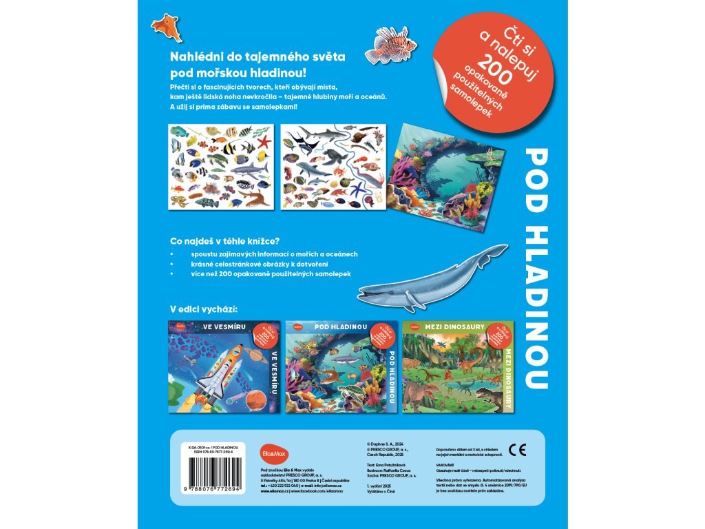 Užijte si spoustu zábavy s úžasnými adhezivními samolepkami, díky nimž stvoříte svůj vlastní podmořský svět! V téhle knížce jich objevíte více než dvě stovky a můžete s jejich pomocí donekonečna dotvářet překrásné celostránkové obrázky, k nimž samolepky jednoduše přilnou. Vedle toho tu najdete také poutavý text plný zajímavých informací o mořích a oceánech. Zavítáte do tajemného světa pod mořskou hladinou – dozvíte se o fascinujících tvorech, kteří obývají místa, kam ještě lidská noha nevkročila: neprozkoumané hlubiny slaných vod.