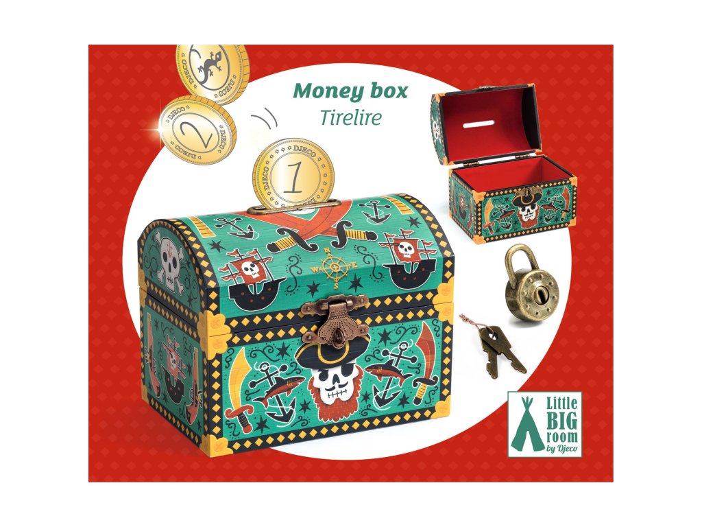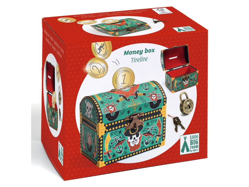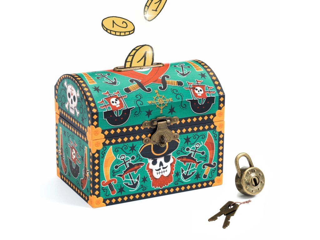 Pirátská kasička od Djeco je krásně zdobená truhla, do které si děti mohou schovat peníze nebo své drobné poklady. Díky uzamykatelnému zámku s klíčkem zůstane obsah v bezpečí. Děti si tak hravou formou osvojují první zkušenosti se spořením i starostí o své věci.