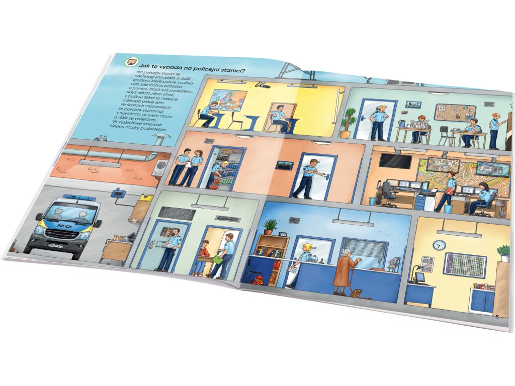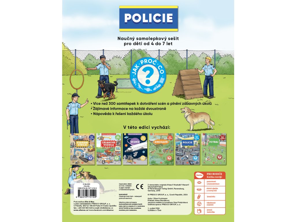 Jak? Proč? Co? V tomhle naučném samolepkovém sešitě pro děti od 4 do 7 let najdete odpovědi snad na všechny zvídavé otázky týkající se práce policistů. Na každé dvoustraně se dočtete spoustu zajímavostí, a navíc máte k dispozici přes 300 samolepek k dotváření scén a plnění zábavných úkolů! Ty zapeklitější vám dají možná trošku zabrat, ale žádný strach – na konci knížky nechybí malá nápověda…
