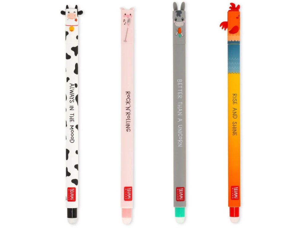 Když uděláte chybu s gumovacími pery Legami Erasable Gel Pens, stačí je otočit a chybu vygumovat, opravit a přepsat. No není to jednoduché? Navíc mají podobu legračních zvířátek z farmy, se kterými je o zábavu postaráno.