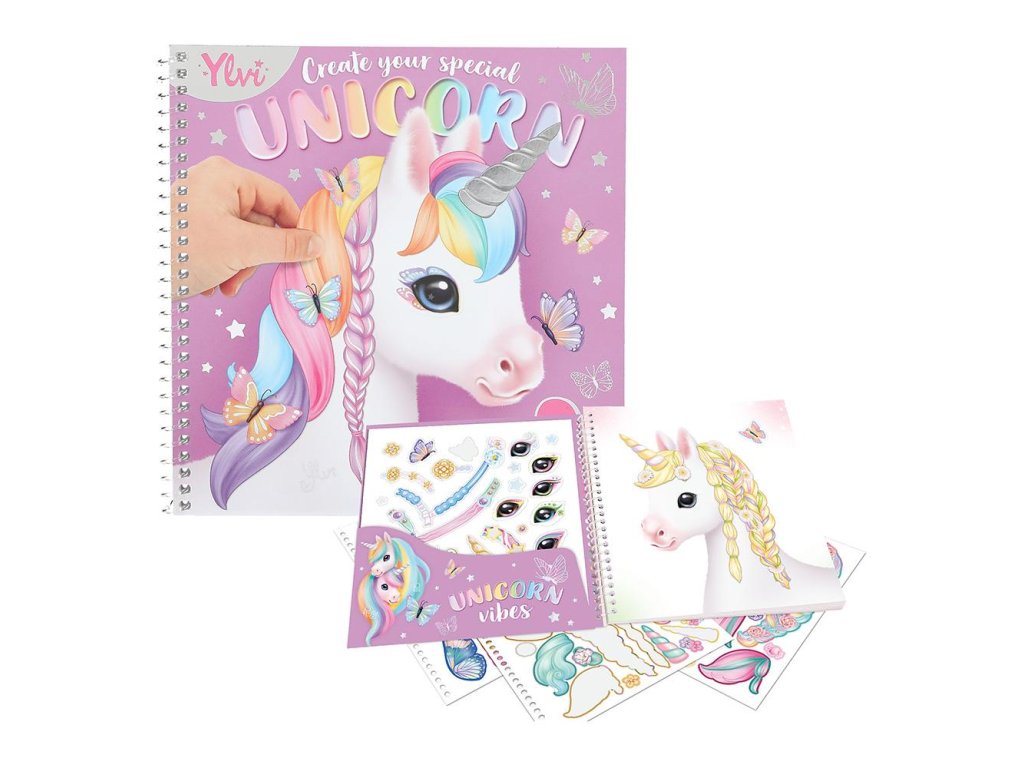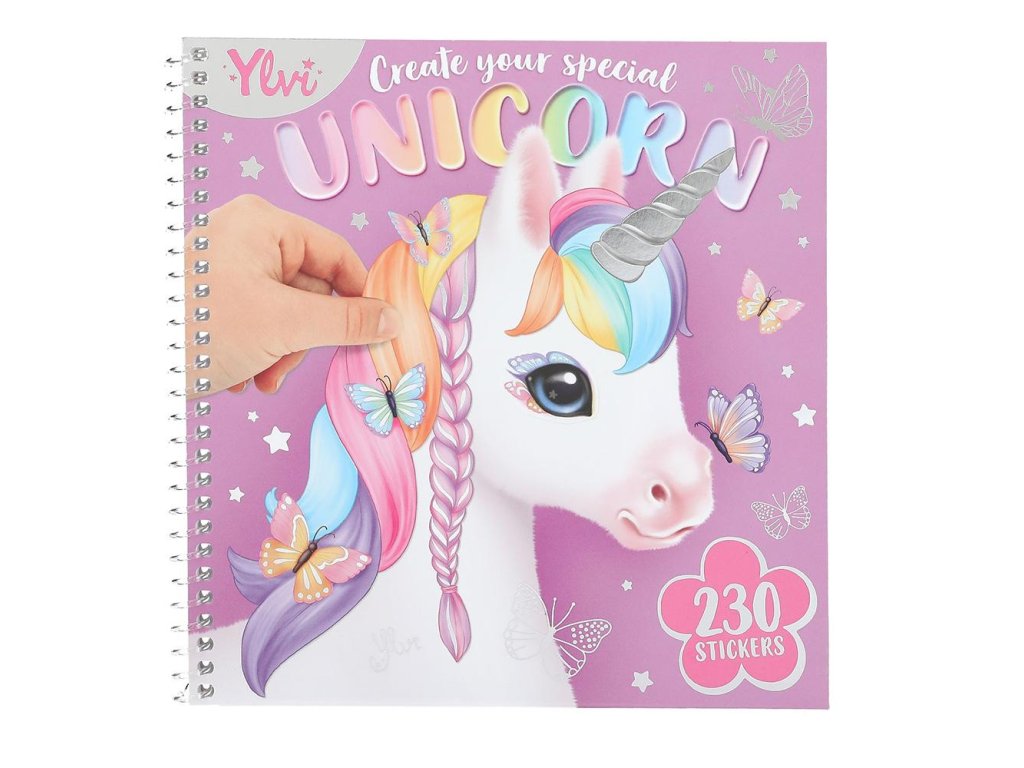 230 samolepek – spirálový kreativní sešit od Ylvi s 24 kouzelnými hlavami jednorožců a 11 archy samolepek pro jejich dotvoření.