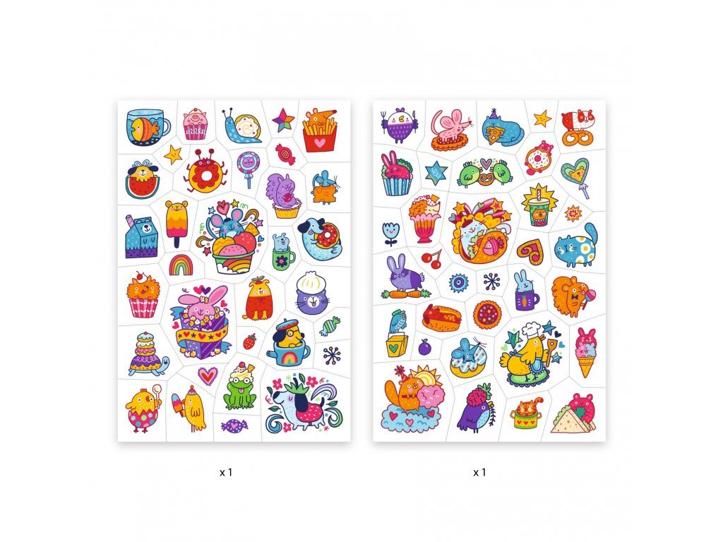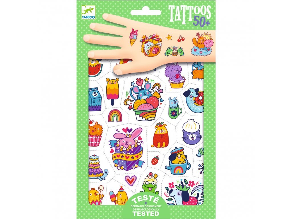 Tetování Djeco obsahuje dva archy a na nich přes 50 různých tetovaček. Toto je na téma zvířátek ve sladkém světě. Tetování je dermatologicky testováno a dlouho vydrží.