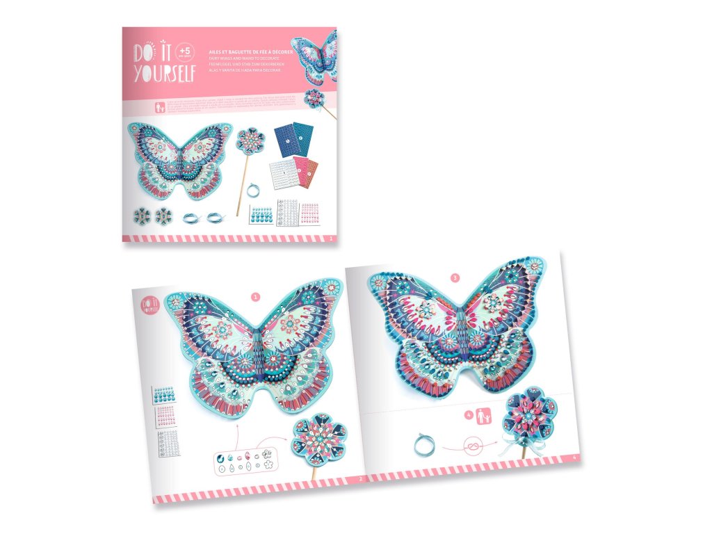 Balení obsahuje: pár barevných křídel z odolného kartonu, 2 gumové popruhy, kouzelnou hůlku, 5 archů s pěnovou třpytivou mozaikou, 3 archy se třpytivými kamínky, obrázkový návod.