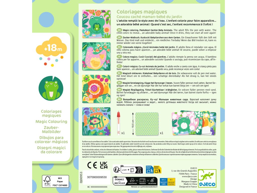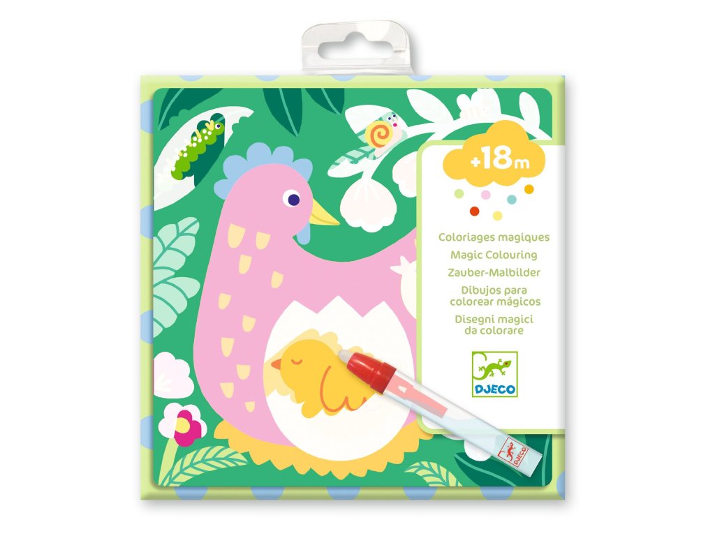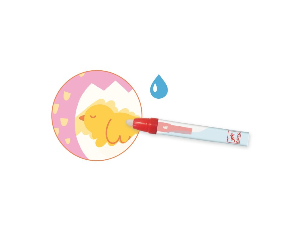 Magické vybarvování vodou je skvělá první kreativní aktivita pro děti od 18 měsíců. Stačí naplnit pero vodou a přetírat bílé plochy – pod nimi se postupně objeví roztomilá mláďátka ze zahrady. Jakmile obrázky uschnou, kouzlo zmizí a děti mohou začít znovu.