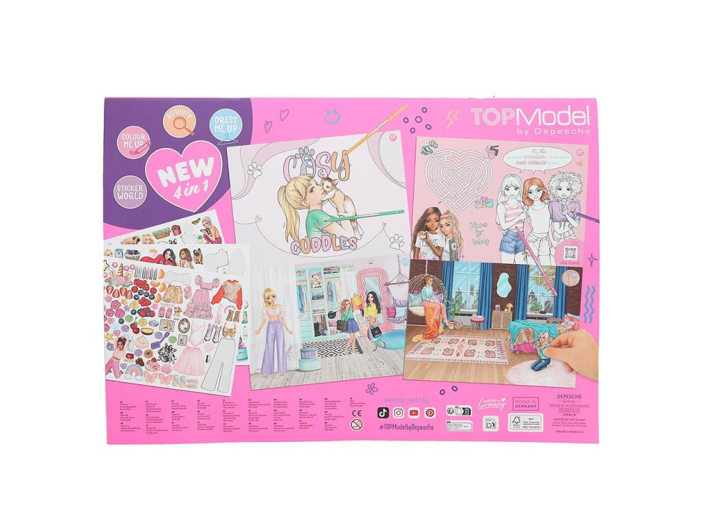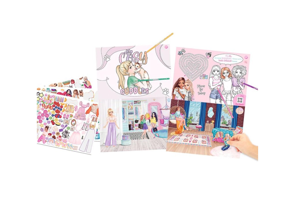 Součástí jsou 4 strany cool TOPModel samolepek, díky kterým můžete dotvořit módu, interiéry i scénky podle své fantazie. Extra velký formát 42 × 30 cm poskytuje opravdu hodně místa pro kreativitu.