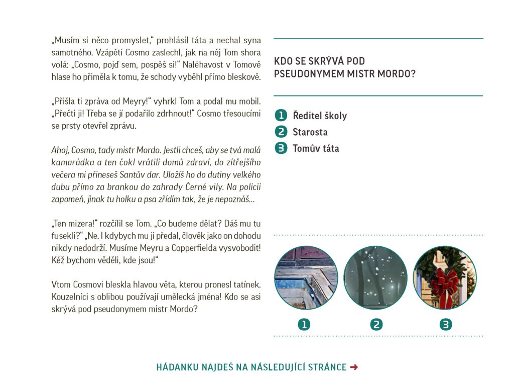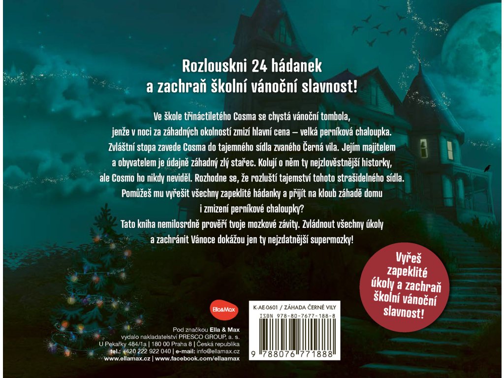 Ve škole třináctiletého Cosma se chystá vánoční tombola, jenže v noci za záhadných okolností zmizí hlavní cena – velká perníková chaloupka. Zvláštní stopa zavede Cosma a jeho kamarády do tajemné Černé vily. Rozhodnou se, že rozluští tajemství tohoto strašidelného sídla. Máte dost odvahy a důvtipu? Pomůžete jim? Jen když postupně vyluštíte všech 24 zapeklitých hádanek, dokážete přijít na kloub záhadě domu i zmizení perníkové chaloupky, a zachránit tak školní vánoční slavnost!